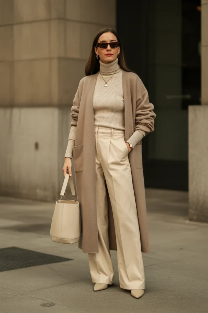 Monochrome dressing is a key trend in Madrid Spain Outfit Ideas February 2026, and beige tones create an especially elegant aesthetic. This head-to-toe neutral palette exudes understated luxury while being incredibly practical for Madrid’s February climate. The long cashmere cardigan provides warmth with a relaxed elegance, perfect for the city’s laid-back yet polished vibe. Layering different textures within the same color family adds visual interest without overwhelming the senses.
