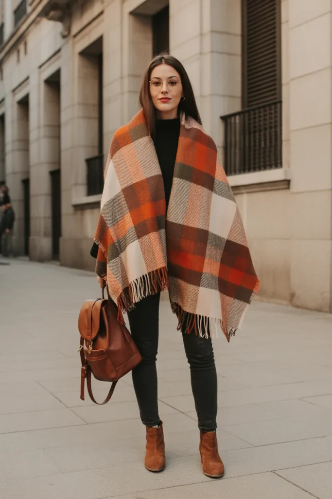 When curating your Madrid Spain Outfit Ideas February 2026, never underestimate the power of an oversized scarf as your statement accessory. This substantial plaid scarf serves multiple purposes: it adds warmth during chilly February mornings, provides a pop of color and pattern to an otherwise simple outfit, and can double as a blanket during long train rides or outdoor café sessions. The warm autumn tones complement Madrid’s terracotta rooftops and historic stone buildings beautifully.