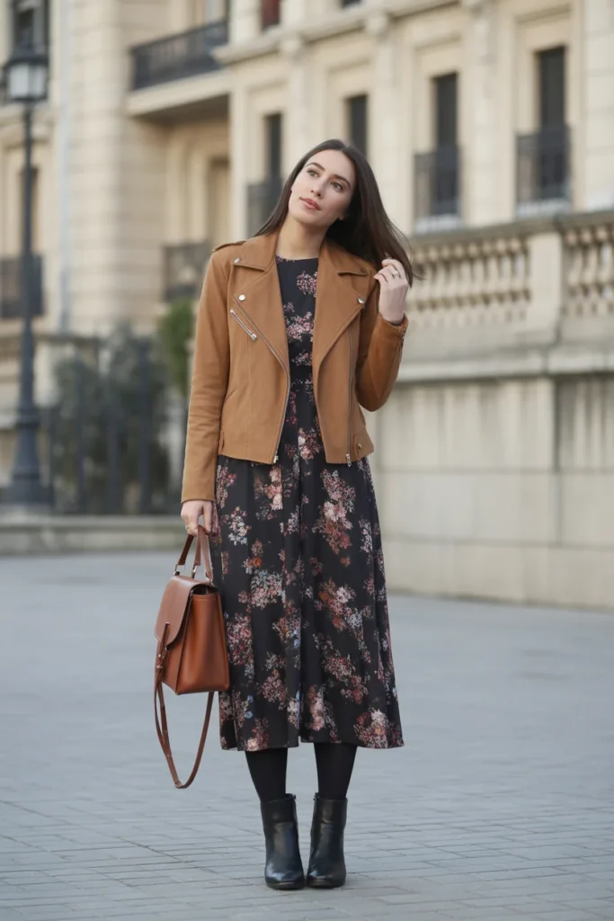 Incorporating feminine elements into your Madrid Spain Outfit Ideas February 2026 doesn’t mean sacrificing warmth or practicality. This floral midi dress in winter-appropriate muted tones maintains a romantic aesthetic while the long sleeves and midi length provide adequate coverage for February temperatures. The suede moto jacket adds an edgy contrast to the dress’s softness while providing wind protection and a touch of Madrid’s contemporary fashion sensibility.