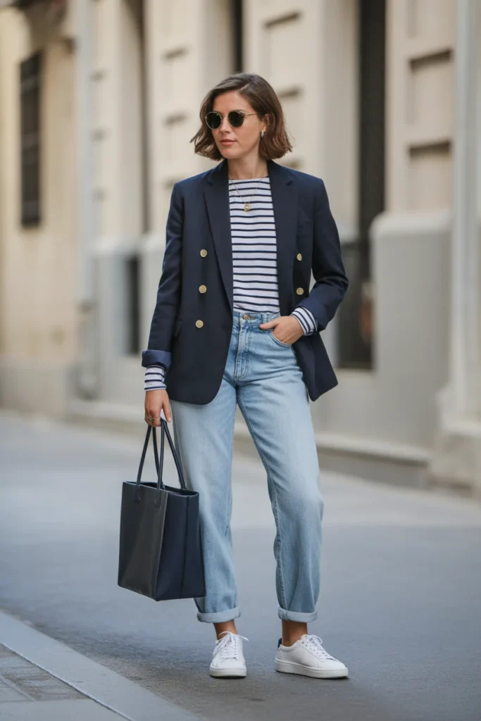 The tailored blazer is a cornerstone of Madrid Spain Outfit Ideas February 2026, offering structure and warmth while maintaining a polished appearance. This navy blazer works overtime in your travel wardrobe, transitioning seamlessly from daytime sightseeing to evening cocktails at rooftop bars overlooking the city. The classic Breton stripe underneath adds a playful touch while remaining sophisticated enough for Madrid’s style-conscious atmosphere.