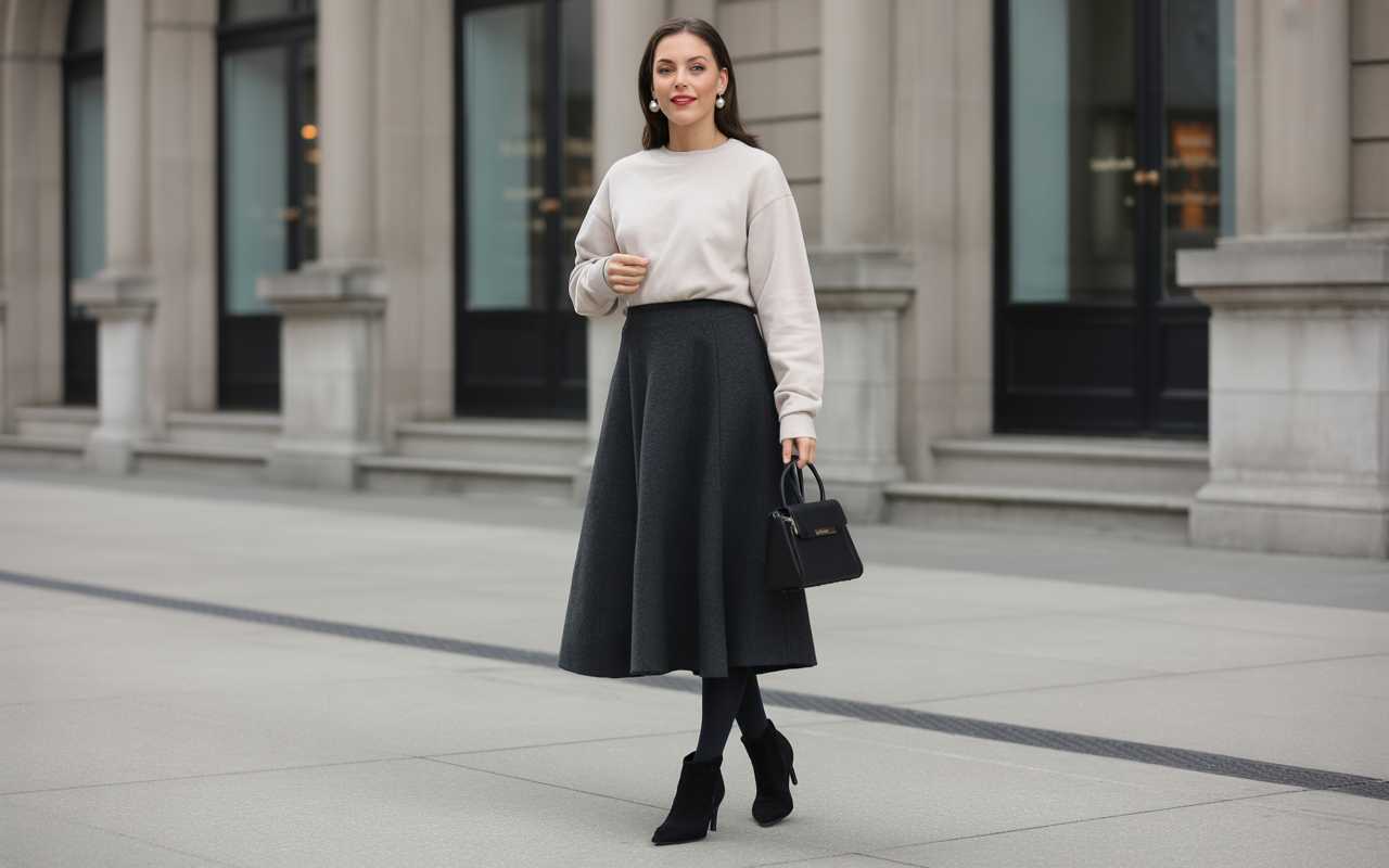 Perfecting this autumn outfits ideas look involves thoughtful attention to proportion and hosiery choices. Black opaque tights create a seamless line from skirt to suede boots, elongating your legs beautifully. Pearl earrings add classic feminine charm while a structured handbag provides practical functionality. This outfit proves sophisticated dressing doesn’t require sacrificing comfort.
