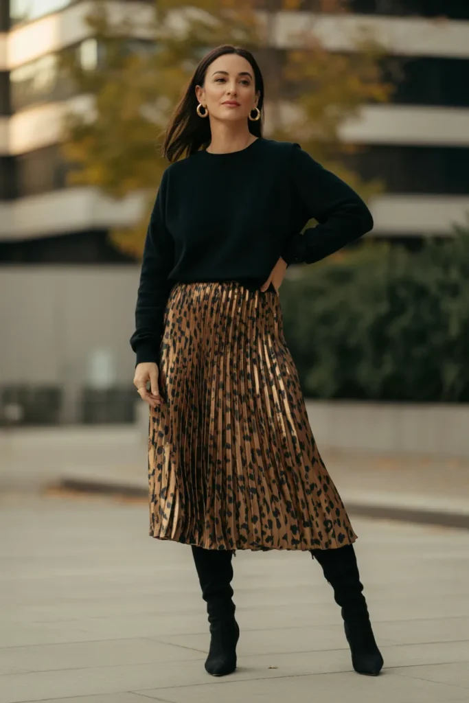 Leopard print continues to reign as a neutral in 2026, and this midi skirt outfit proves exactly why. The pleated silhouette adds movement and femininity while the print brings instant personality to your look. Pairing it with a simple black sweater allows the skirt to shine without competing patterns. This outfit feels special enough for date nights yet remains comfortable enough for daily mom duties.