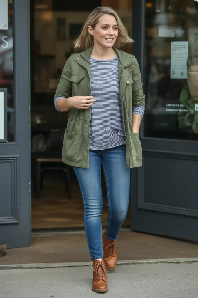 The utility jacket remains a fall wardrobe hero for moms who need functional fashion. This olive green version offers multiple pockets for storing essentials like tissues, lip balm, and your phone. Layered over a timeless navy and white striped tee, you get a classic combination that never goes out of style. Skinny jeans create a balanced silhouette that works perfectly with the jacket’s relaxed fit.
