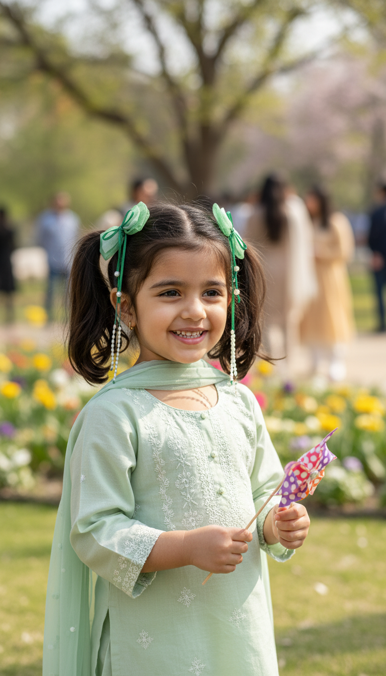A sweet little girl beams with joy at an outdoor celebration, dressed in a beautiful mint green embroidered shalwar kameez with matching dupatta. Her hair is adorned with cute green ribbon bows, and she holds a small colorful toy in her hand. The sunny day, fresh garden setting, and festive background filled with family and laughter create a heartwarming, cheerful atmosphere — perfect for capturing the essence of childhood happiness.