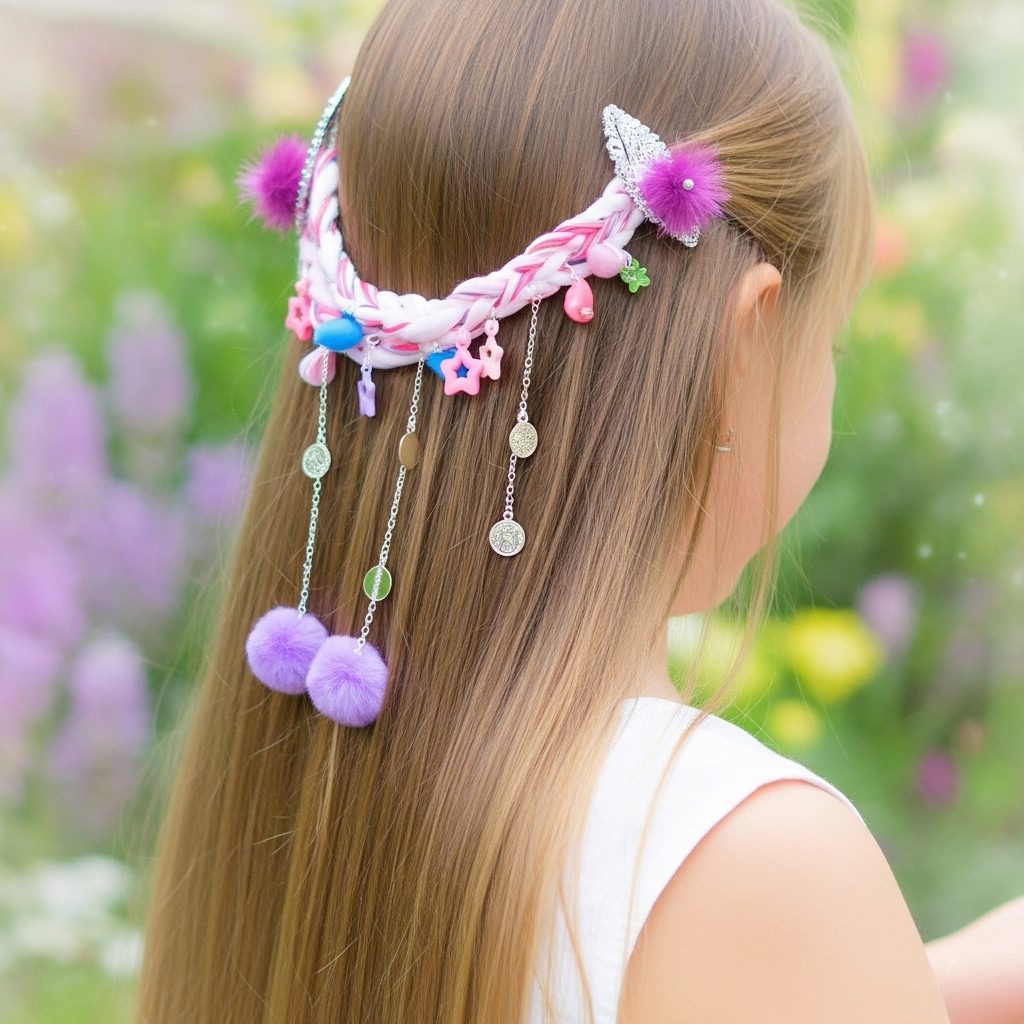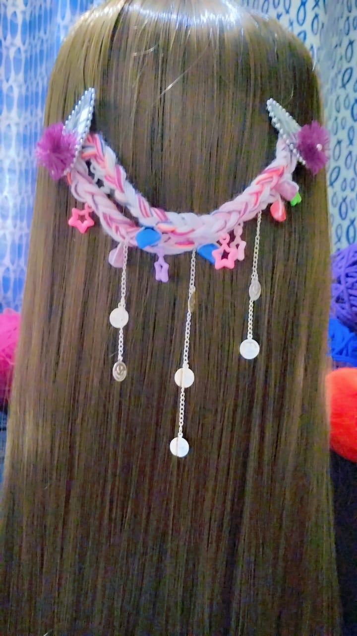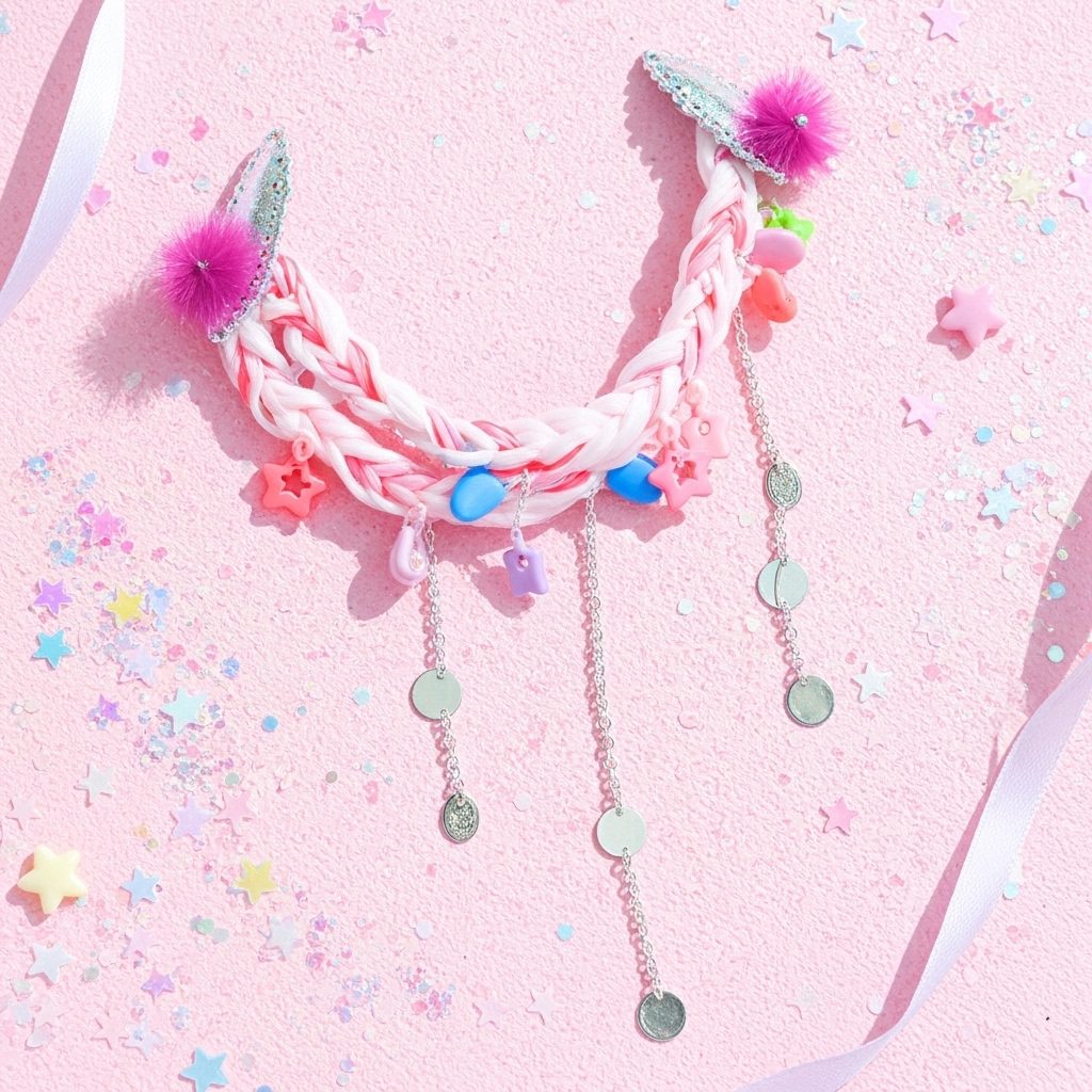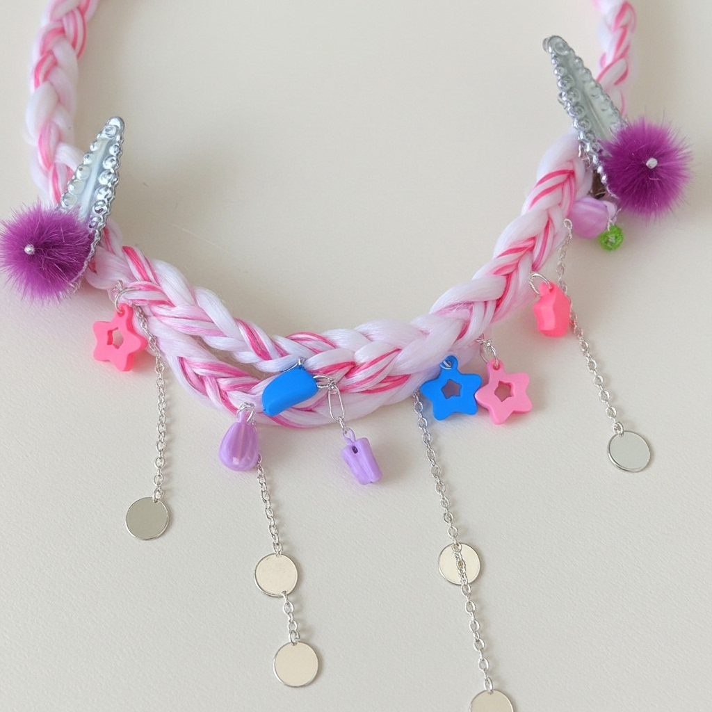 Further enhancing its whimsical appeal are delicate silver chains, each holding shimmering round charms, and fluffy purple pom-poms that accent the clips. Designed for comfort and secure wear, this hair chain is perfect for adding a touch of playful magic to any hairstyle. Whether for a themed birthday party, a cosplay event, or just to brighten an ordinary day, the Dreamland Pastel Hair Chain is a unique statement of joy and imagination. โจ