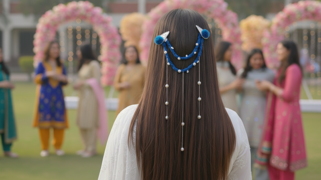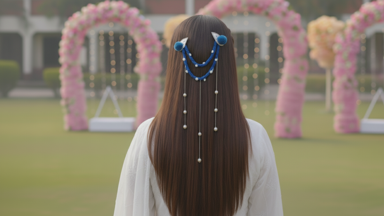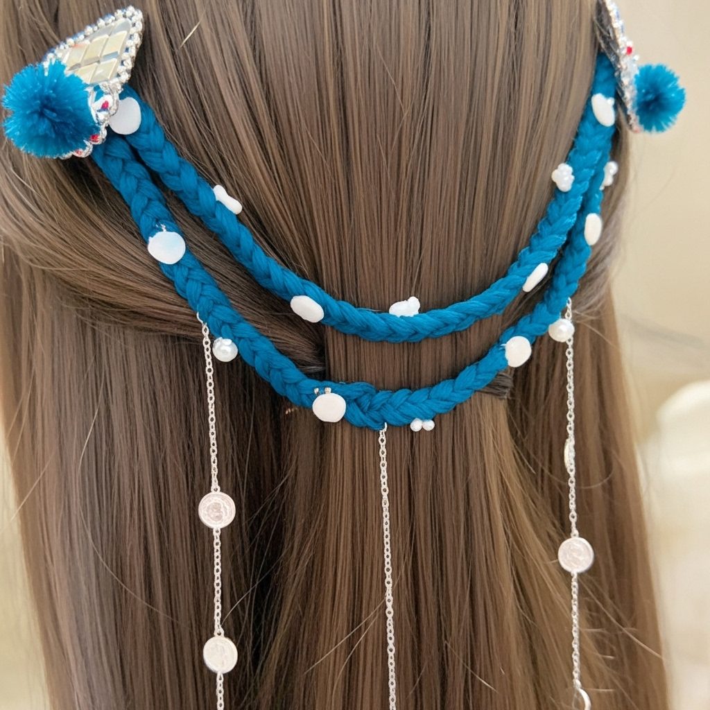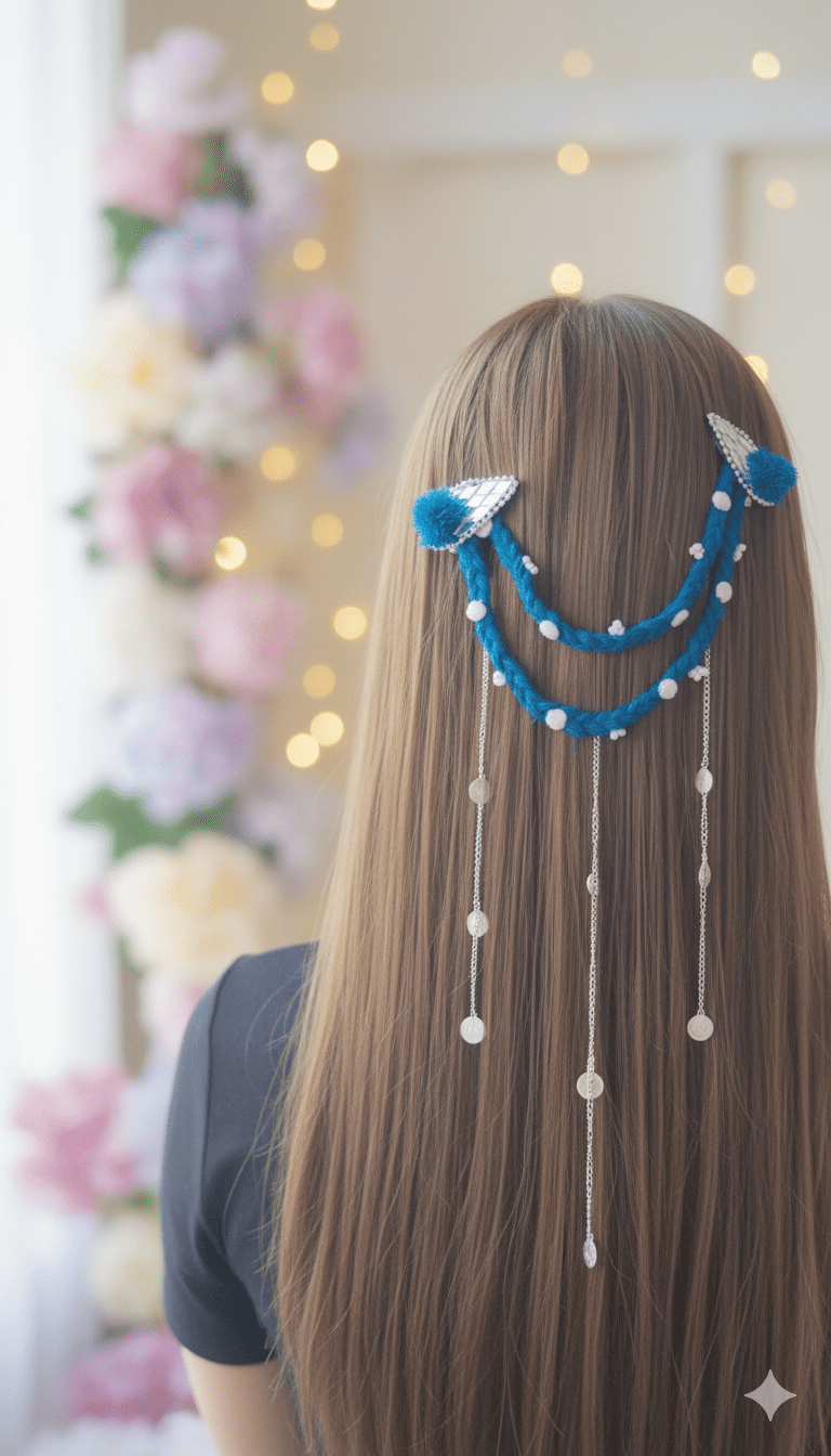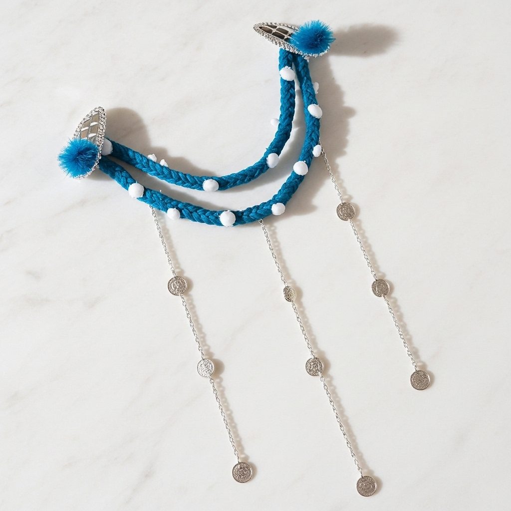 Let your hairstyle shimmer with the Ocean Dream Blue Braided Hair Chain, inspired by waves and moonlight. This unique piece combines a thick, handwoven teal-blue braid with delicate silver chains that cascade beautifully down the hair. The coin-shaped charms catch the light as you move, creating a mesmerizing sparkle that enhances any occasion.