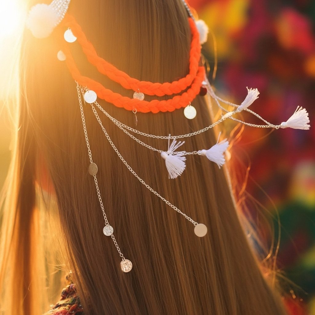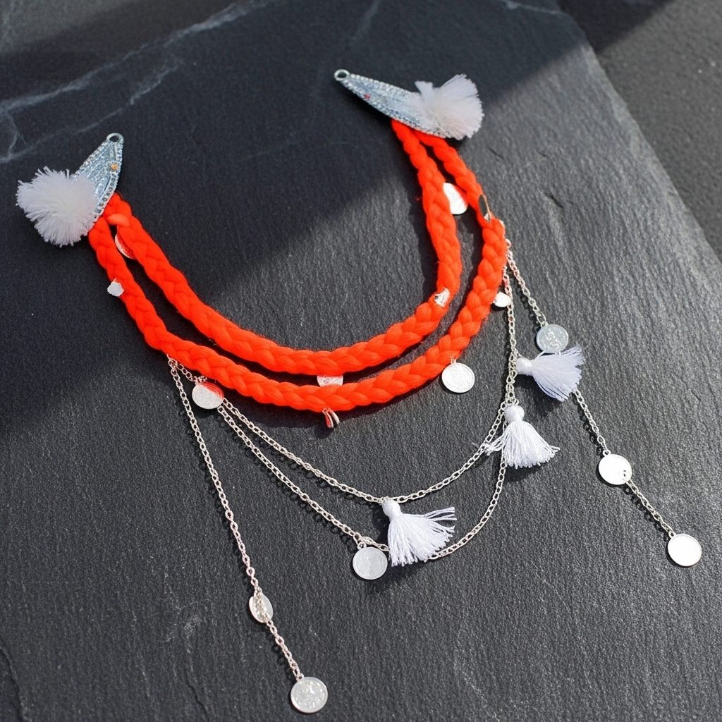 Ignite your style and turn every head with the Inferno Sunset Orange Braided Hair Chain. Inspired by the dramatic colors of a fiery evening sky, this unique piece beautifully merges a thick, handwoven vibrant orange braid with polished, multi-strand silver chains.
