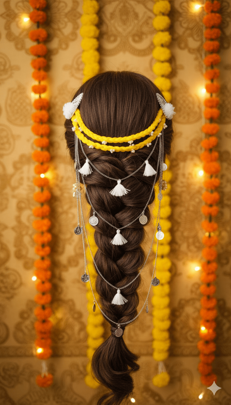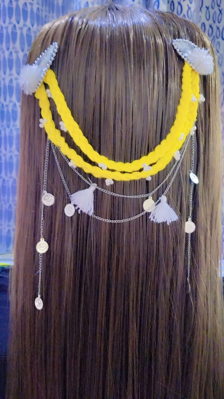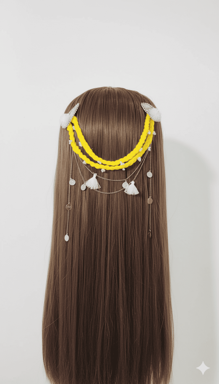 Turn heads with this Yellow Braided Tassel Hair Chain β a must-have for festive and bridal hairstyles. π The bold yellow braids symbolize joy and celebration, while delicate pearl accents add a touch of grace. Layered silver chains drape beautifully across the hair, decorated with shiny coin charms and soft white tassels π, creating a perfect mix of tradition and modern glam.